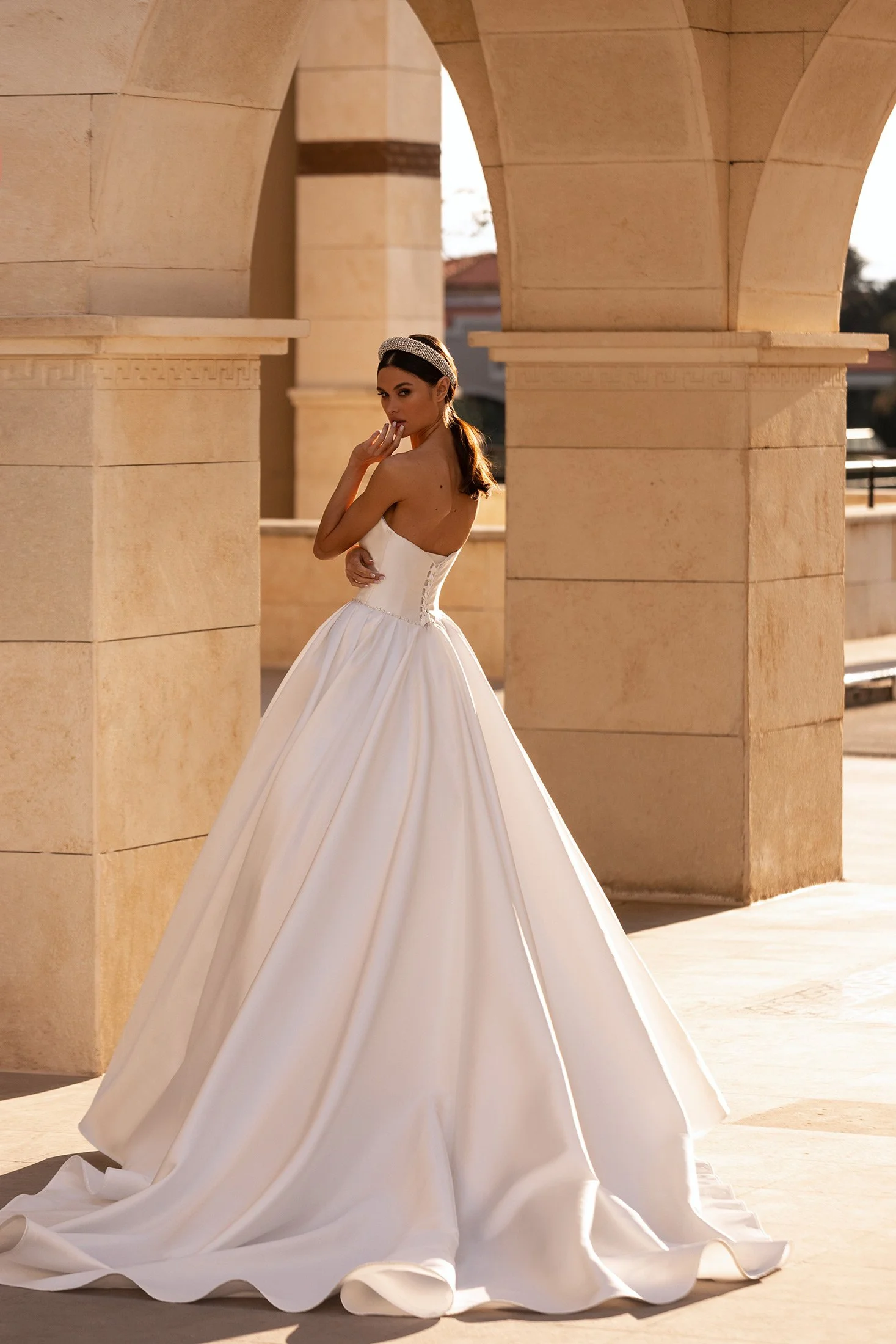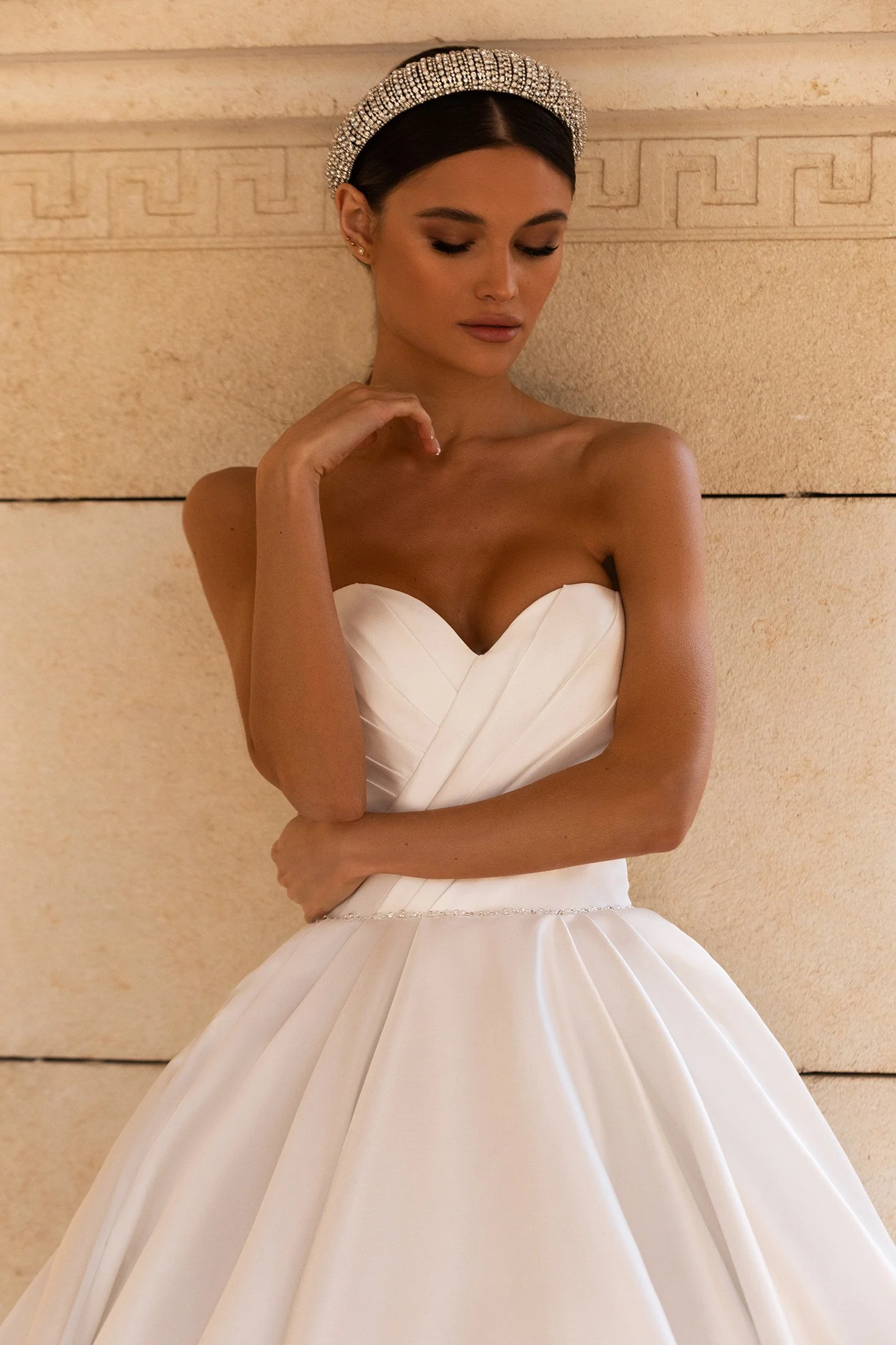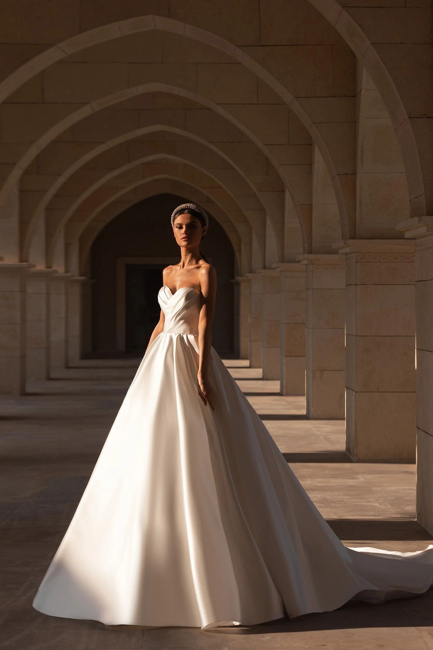 Aria Bridal is for the bride who loves clean lines, sophisticated silhouettes, and modern minimalism. This collection is perfect for those who appreciate understated beauty with high-fashion elements, offering sleek satins, architectural draping, and refined details. Aria gowns are effortlessly chic—ideal for brides who want a timeless look with contemporary appeal.