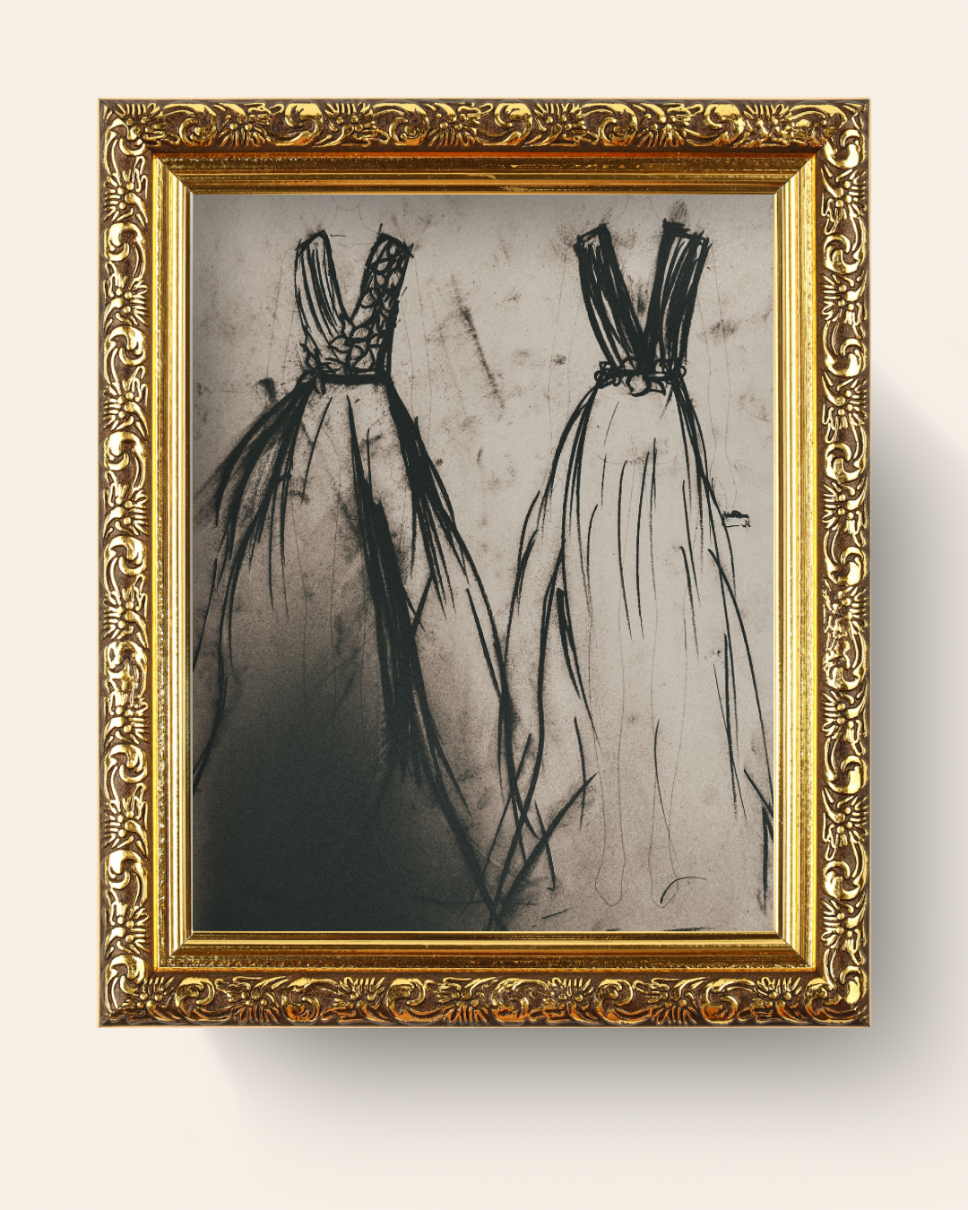 Printed on premium matte paper, The Bridal Diptych captures two wedding gown silhouettes side by side — one with an intricately sketched corset back, one with a flowing tie silhouette. Each archival print is mounted on acid-free board and sealed for preservation.