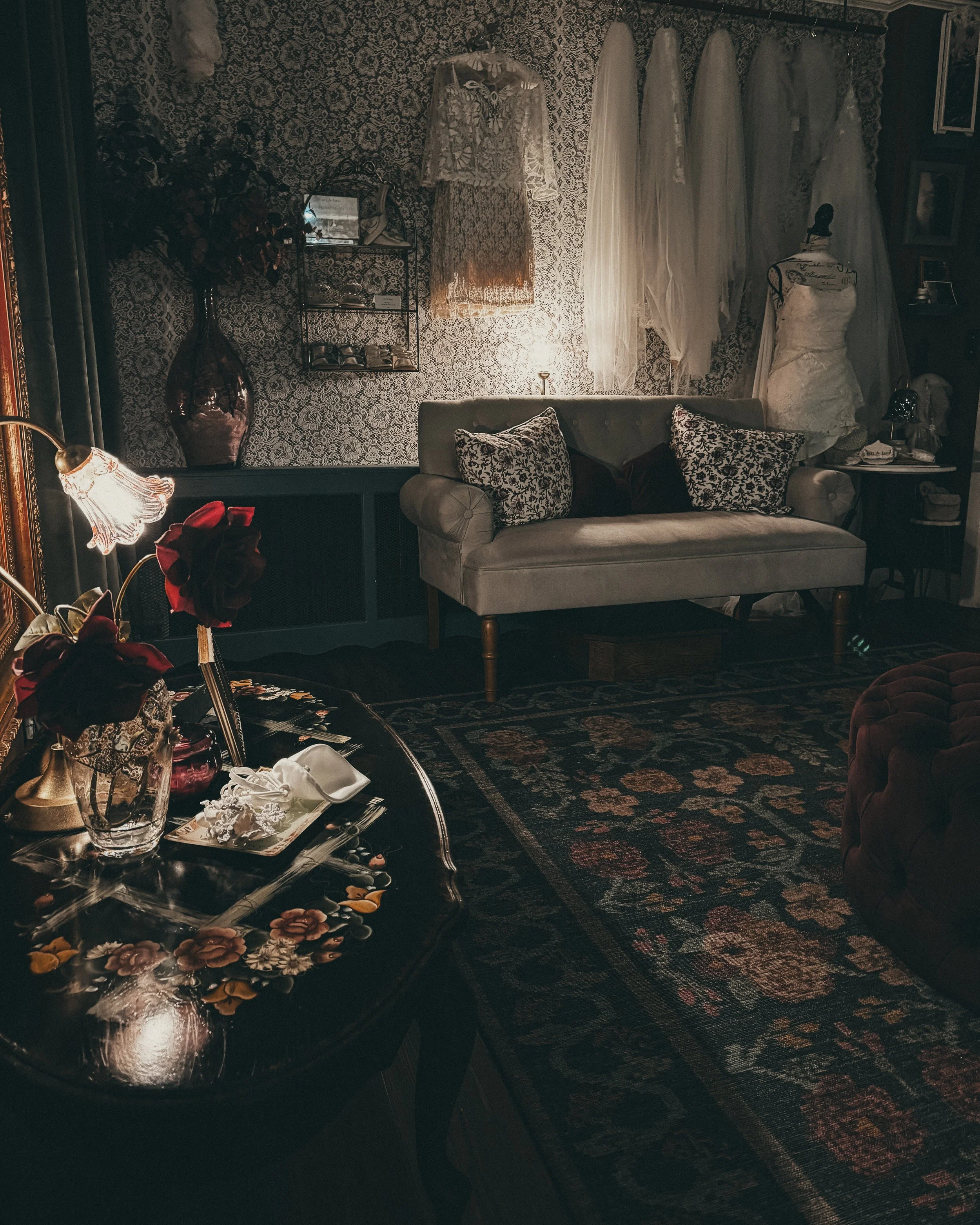 A warm, intimate, vintage-inspired space designed for one bride at a time. Lace, florals, textures, rugs, curated racks - every corner built for a moment.